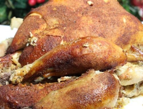 Ингредиенты: -4 чайные ложки соли, или по вкусу -2 чайные ложки паприки -1 чайная ложка кайенского перца -1 чайная ложка молотого тимьянака 1 чайная ложка молотого тимьяна -1 чайная ложка молотого белого перца -1/2 чайной ложки чесночного порошка -1/2 чайной ложки молотого черного перца -1 целая курицу Способ приготовления: 1) Смешайте соль, паприку, кайенский перец, луковый порошок, тимьян, белый перец, чеснок и черный перец вместе в маленькой миске. 2) Натрите полученной смесью всю курицу цуликом, чтобы. Положите курицу в пакет и оставьте на 8 часов в холодильники, чтобы курица полностью пропиталась специями. 3) Извлеките курицу из пакета. Поместите курицу в рукав для запекания или оберните фольгой и запекайте в духовке до полного приготовления.