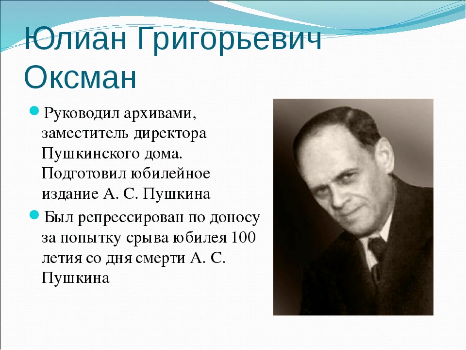 Трагическая история XX века и ее связь с историей века XIX 15 июня 1937 года. XX век, да, вы не ошиблись. На пять лет осужден историк и пушкинист Юлиан Оксман, зам. директора Пушкинского дома. Прежде всего, мы знаем его по работам, связанным с именем Пушкина – в 1930-ые годы Пушкинский дом как раз издавал юбилейное собрание сочинений Пушкина. Должны были закончить к 1937, к столетию смерти поэта. Но помимо этого, Оксман активно занимался и декабристами. К юбилейному же 1925 году, столетию восстания декабристов, при его участии было издано несколько сборников документов – эта работа и сейчас не теряет актуальности. Он был арестован по доносу. «Попытка срыва юбилея Пушкина, путем торможения работы над юбилейным собранием сочинений», - было написано в нем. В 1937 году в научной среде вообще доносы друг на друга писали широко и уберечься для человека, который был занят работой, а не интригами, было малореально. Потом среди обвинений фигурировала закупка для Пушкинского дома нескол