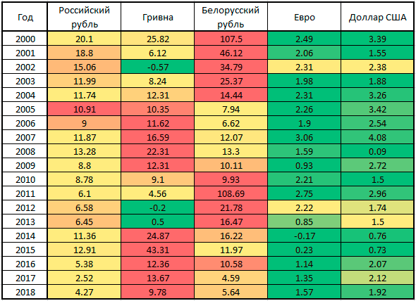 В последнее время я часто думаю над вопросом: "Какая валюта лучше подходит для инвестирования?" Эта тема постоянно проскальзывает в статьях, плюс сложная экономическая обстановка в Украине подталкивает на подобные размышления. По идее, на выбор валюты для инвестирования влияет множество факторов - динамика курса, простота обмена, личные предпочтения инвестора... Тем не менее, в первую очередь обращаешь внимание именно на фактор инфляции - ведь обесценивание денег постоянно делает нас беднее. Предлагаю вам взглянуть табличку со сравнением инфляции в некоторых странах бывшего СССР и передовых экономиках, как говорится, "вместо тысячи слов":