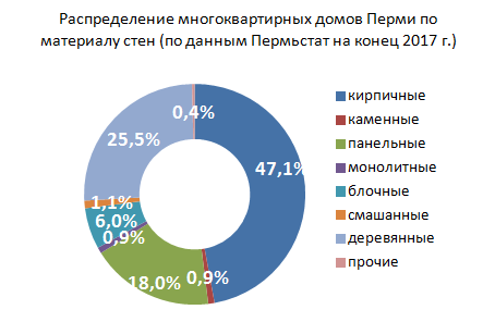 Выбирая себе квартиру любой покупатель задумывается о том, из чего строят дом, насколько он будет надежным и долговечным? Когда говорят о материале дома, в большинстве случаев, подразумевают материал стен. Однако, если мы видим кирпичный фасад, это не всегда значит, что стена полностью кирпичная. В современных зданиях состав стен достаточно сложен и многослоен. С точки зрения строительного дела принципиально рассматривают основной материал несущих конструкций и основной материал ограждающих конструкций. Какие технологии в приоритете у застройщиков - тема нашей статьи. Начнем с существующего жилищного фонда Перми. Пермьстат собирает статистику по материалу стен как ограждающие конструкции по следующим вариантам: кирпичные, каменные, панельные, монолитные, блочные, смешанные, деревянные, прочие (см. график ниже). Как мы видим, практически половина - это дома с кирпичными стенами. Четверть многоквартирных домов с деревянными стенами. На третьем месте панельные дома. Дома с другими материа