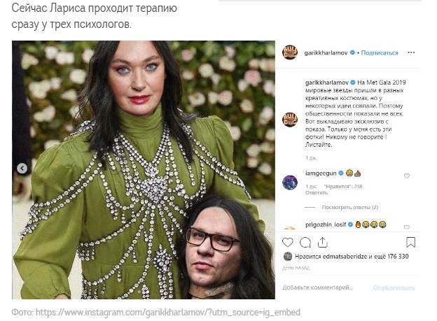 Гарик Харламов, выложил в инстаграм, шутливое фото. Поводом разыграть звезду стал бал Института костюма Met Gala. Гарик использовал фото звезды этого вечера – голливудского певца и актера Джареда Лето, который пришел на мероприятие с копией своей головы. У Ларисы Гузеевой, совсем недавно умерла мама. Актриса разбита, находится в депрессии, даже мысли о самоубийстве приходят ей в голову. Кому то этот прикол пришелся по нраву, но большинство, особенно поклонники Гузеевой, пришли в ярость. Были люди,которых насмешил поста Гарика. "Все таки снесла тебе голову Гузеева. Аккуратнее со словами😀😀😀 (здесь и далее орфография и пунктуация авторов сохранены. – Прим. ред.)", "Она добралась до тебя Гарик🤣😁", "Гарик тебе не пугает что тебе идут длинные волосы", – писали фанаты в комментариях.
