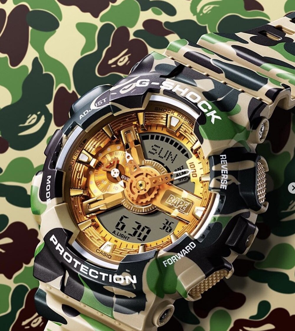 Часы с узнаваемым камуфляжем и обезьяньей головой, выпущенные к юбилеям японских брендов Формальным поводом для коллаборации является 35-летие G-Shock и 25-летие A Bathing Ape, известного также как BAPE. И это большой праздник для фанатов часовой марки, учитывая культовый статус партнера в мировой уличной культуре. Японские бренды уже сотрудничали друг с другом, но впервые для работы выбрана модель с аналогово-цифровым дисплеем. Эксклюзивные часы на базе GA-110 с привычным набором характеристик вроде ударопрочности, водонепроницаемости до 200 метров, таймера, секундомера и светодиодной подсветки, раскрашены фирменным камуфляжным принтом BAPE 1st Camo, с которым контрастирует золотой дисплей с надписью BAPE в районе трех часов. Знаменитый логотип бренда, голова обезьяны, нарисован на ремешке и выгравирован на задней крышке часов. Фото: BAPE Понравилась статья? Ставьте лайк и читайте про 7 вещей, которые должен знать коллекционер G-Shock И подпишитесь на наш канал, чтобы читать о новы