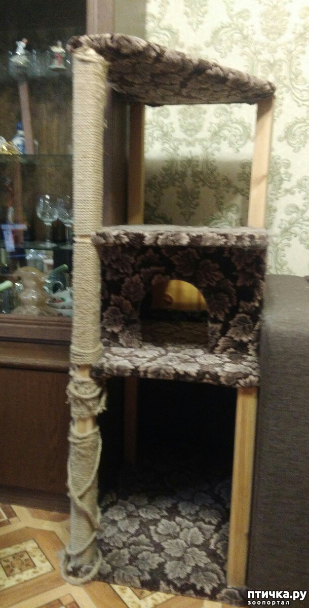 Первый мой рассказ о наших котейках написан чуть больше года назад. Мы с мужем из подручных материалов построили домик. Тогда я планировала сразу сделать им гамачок в нижней части. Но поскольку стоит домик очень плотно, между шкафом и диваном, то как все соорудить, я никак не могла придумать. Как видите на нем живут (или в нем?) и активно точат когти. Муж уже два раза менял веревку. Кстати такая, хоть и толстая, пеньковая, но очень не практичная. Быстро треплется и с нее много мусора. У Тишки на дралке намотана синтетическая и ее хватает гораздо дольше. И вот однажды в магазине я наконец-то увидела чего хочу. и как это можно сшить самой! Причем подвесить можно на журнальный столик и все будут довольны. Как следует все рассмотрела и запомнила.