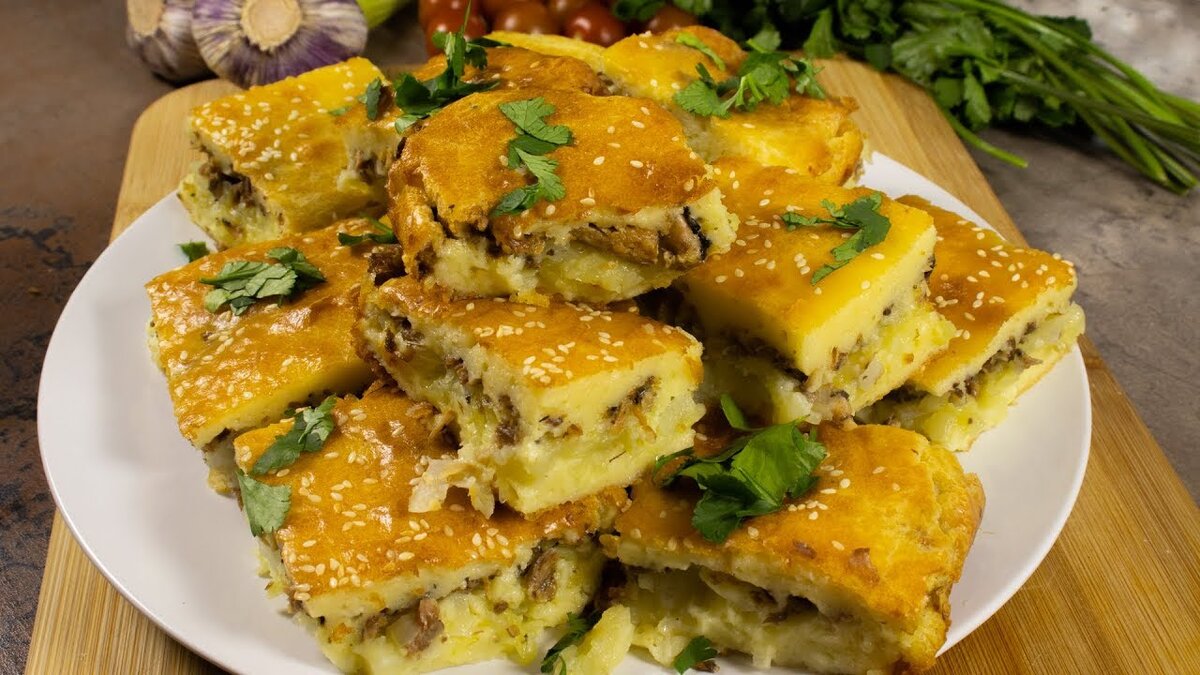 Очень вкусный и простой в готовке пирог с рыбкой и картофелем! Я его называю ленивый пирог, потому что приложив минимум усилий получаем невообразимую вкуснятину! Пошаговый рецепт: 1.Смешиваем 300 г сметаны, 300 г майонеза и 4 яйца. 2. Добавляем 8 ложек муки и хорошо перемешиваем до однородной массы. 3.Далее выливаем половину теста в форму для запекания предварительно смазанную раст. маслом. 4. На крупной терке на тесто натираем 2 отваренных в мундире картофелины. 5. Сверху посыпаем мелко порезанным луком (1 средняя луковица) 6.Далее нам понадобится 1 банка рыбной консервы(в собств. соку или в масле). 7.Измельчаем рыбу вилкой. 8. И выкладываем в форму поверх картофеля и лука. 9. Выливаем оставшуюся половину теста в форму и равномерно разравниваем. 10. Посыпаем кунжутом(по желанию) и отправляем в духовку разогретую до 180 градусов на 25-30 минут. По готовности дайте пирогу немного остыть и порежьте на порционные кусочки. Приятного аппетита! На youtube-канале можно посмотреть подроб