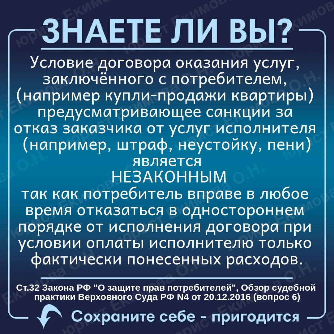 В чем суть ситуации? Допустим, вы хотите продать или купить квартиру. Идете к риэлтору и заключаете договор. А в договоре указано, что вы не имеете право заключать аналогичные договоры с другими риэлторами или что в случае отказа от договора в одностороннем порядке должны уплатить не хилый штраф. Вообщем, это положение договора изначально является ничтожным, то есть незаконным независимо от того, что включено в договор и вы его подписали. О его незаконности говорит ст.32 Закона РФ "О защите прав потребителей" и судебная практика, а частности Обзор судебной практика Верховного Суда РФ №4 от 20.12.2016 года (вопрос №6). Заплатить придется только за те реальные действия риэлтора, на которые он потратился и в случае предоставления им платежных документов. Например, оплачивал рекламу по вашей квартире. Как правило, документов по таким расходам у риэлтора вообще нет либо из размер незначителен, то есть явно меньше, чем штраф, который вы якобы обязаны заплатить. ✔️Совет юриста: пока нет докум