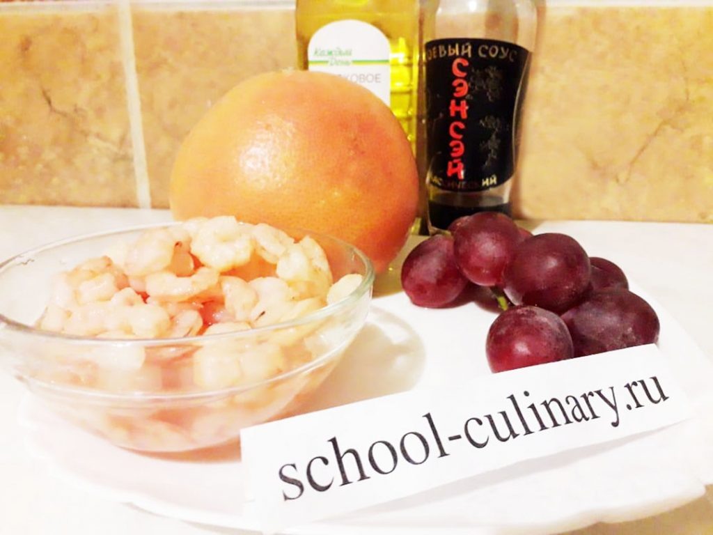 Ингредиенты: Приготовление В первую очередь надо замариновать креветки, для этого сливаем рассол и помещаем креветки в соевый соус так, чтобы они все могли им пропитаться Грейпфрут очищаем от кожуры Разделываем его на дольки Тщательно очищаем дольки от пленок Разделываем дольки на маленькие кусочки Из винограда вынимаем косточки Разрезаем виноград на дольки Складываем в салатницу кусочки грейпфрута и дольки винограда Креветки вынимаем из соевого соуса и реже