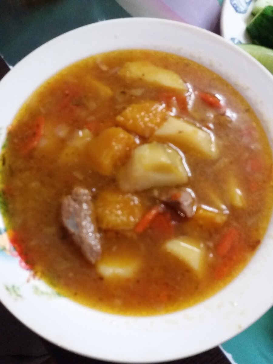 Здравствуйте подписчики и гости канала! Сегодня хочу поделиться с вами рецептом очень вкусного супа . Он очень питательный , густой , надолго насыщает. Конечно летом он не очень актуален , но может кому и пригодится этот рецепт, буду рада. ИНГРЕДИЕНТЫ: мясо говядины( можно грудинку)- 800 гр. лук репчатый- 2 шт. морковь -1 шт. помидор- 2 шт. тыква-200 гр. картофель- 5 шт. соль, перец, приправа любая- по вкусу. масло растительное- 2 ст. ложки. ПРИГОТОВЛЕНИЕ: Мясо вымоем и нарежем на небольшие кусочки. Берем казан или кастрюлю с толстым дном , наливаем растительное масло , выкладываем туда мясо и ставим обжариваться на 30 мин., периодически помешивая . В это время лук порезать на небольшие кусочки , морковь на дольки , помидор на также не крупно порезать. Мясо обжарили,теперь добавляем овощи и тушим 30 мин. Картофель и тыкву режем на крупные дольки , добавляем к овощам. Солим , перчим , добавляем специи по вкусу , все заливаем водой и варим до приготовления картофеля ( примерно 15