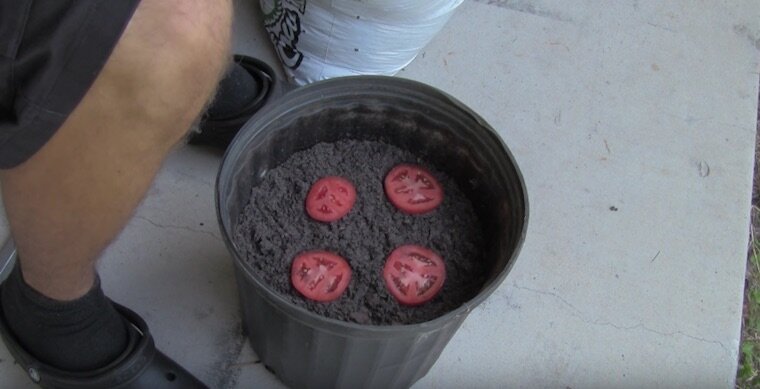 Заполняем широкие емкости для рассады обработанной землей. Затем берем чуть переспевший, крупный и здоровый помидор, нарезаем его кольцами толщиной в 0,5см и раскладываем их в один слой прямо по поверхности почвы. Вот мы и выполнили посев! Остается только присыпать разрезанный овощ землей, убрать емкость с ним в темное место и полить. Пока не появятся первые петельки, умеренную влажность в таре нужно поддерживать постоянно, тогда рассада прорастет быстрее и станет более крепкой.