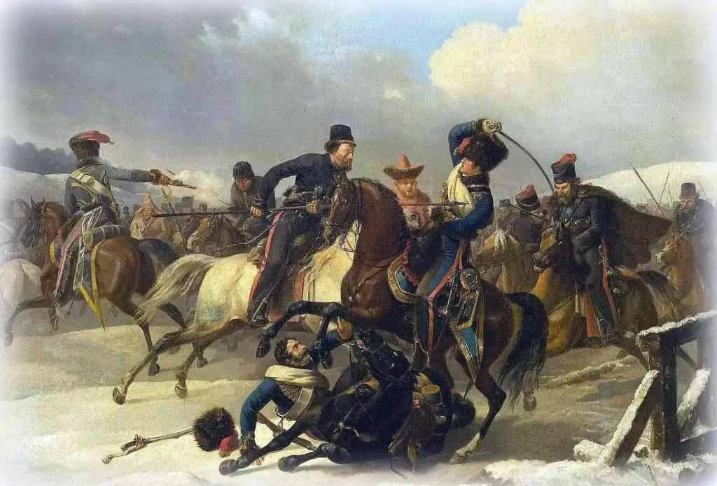 Кроме того, французы в ту кампанию вообще не всегда отличали казаков от калмыков, башкир и других представителей русской иррегулярной “национальной” конницы. Более того, были случаи, когда словом “cosaque” (казак) в наполеоновской армии называли… Гусар! Вообще термин “казак” в наполеоновской армии часто применялся как сленговый, обозначая русскую легкую кавалерию вообще.