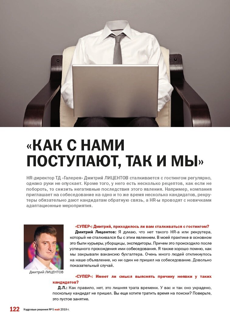 Гостинг распространен в основном среди работников низкооплачиваемых должностей: курьеров, уборщиков, экспедиторов. Большинство сотрудников — люди ответственные, и если понимают, что от их работы зависит результат команды в целом, об увольнении сообщают заранее. Случаи гостинга связаны с психологической атмосферой внутри коллектива. Человек уходит, не оставив никаких следов и записок, если чувствует, что он никому не нужен и не интересен. ПРИМЕР ИЗ ПРАКТИКИ ================================================================ Мы сократили гостинг в разы, когда стали проводить индивидуальную работу с теми, чья мотивация падала. Мы пытаемся доводить до каждого, что он не одинок в этом офисе и от его задач, даже маловажных, зависит работа всей компании. Таким образом мы полностью победили гостинг в курьерской службе. ================================================================ На мой взгляд, предотвратить гостинг невозможно, но можно научиться с ним работать. Можно приглашать большее ко