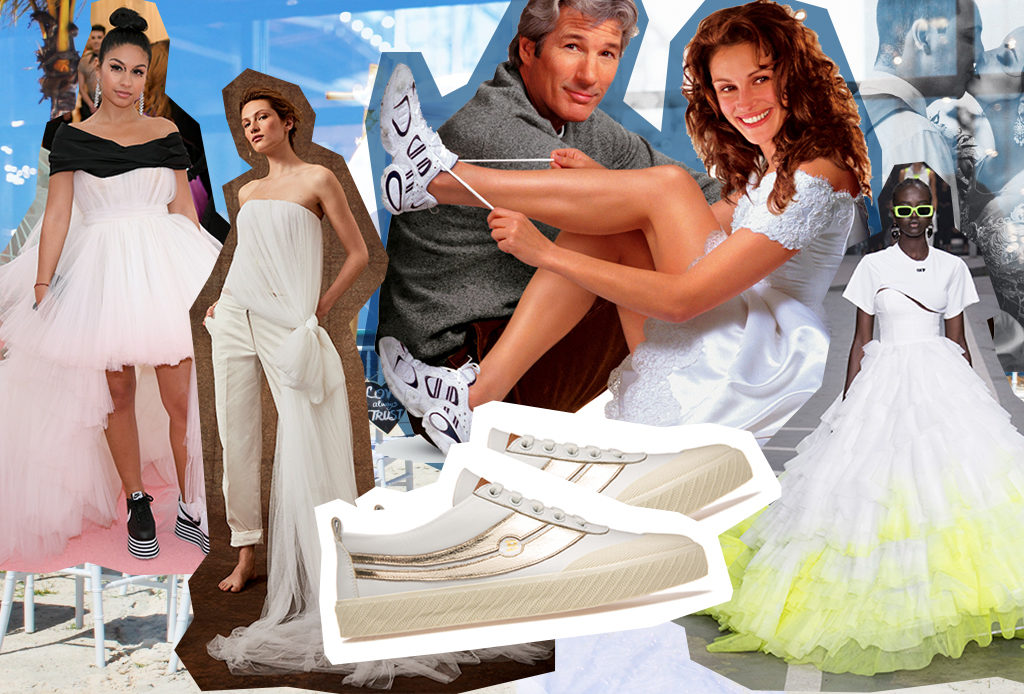 Главная головная боль невесты после платья – выбрать обувь, чтобы было и красиво, и удобно. Героиня Джулии Робертс в фильме «Сбежавшая невеста» решала эту задачу просто – надевала кроссовки. Сегодня такой прием стайлинга можно (и модно) использовать не только для побега из-под венца, но и для самой церемонии!
