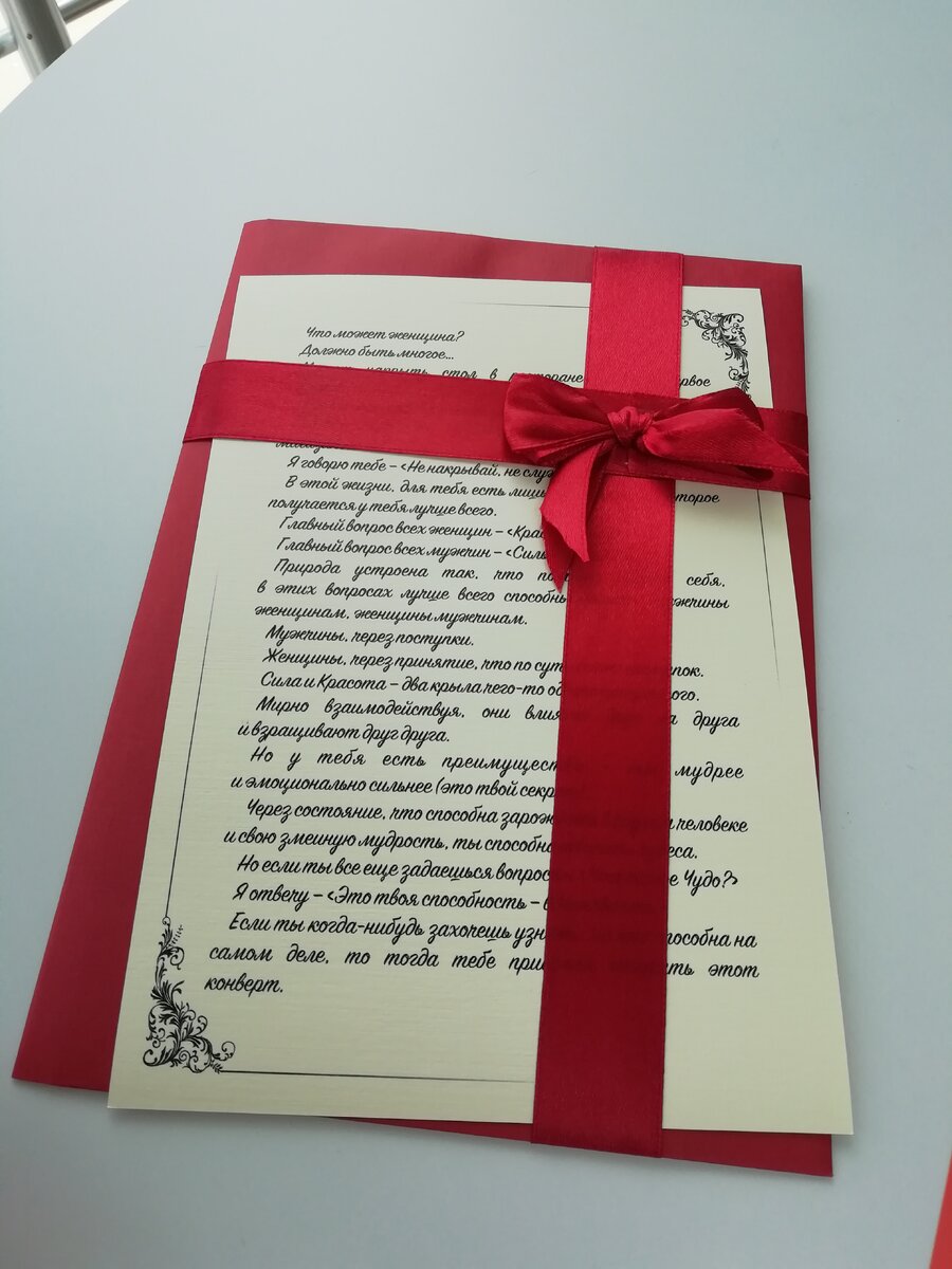 Пришла я в свой любимый магазин, выбрала нарядные туфельки, а мне на кассе "Вам просили передать..." И передали это письмо! Что может женщина? Должно быть многое… Может накрыть стол в ресторане, подать первое и второе. Может служить в полиции за 35 тысяч. Может работать продавцом, например, в обувном магазине… Я говорю тебе – «Не накрывай, не служи, не продавай!» В этой жизни, для тебя есть лишь одно занятие, которое получается у тебя лучше всего. Главный вопрос всех женщин – «Красива ли я?» Главный вопрос всех мужчин – «Сильный ли я?» Природа устроена так, что помимо самого себя, в этих вопросах лучше всего способны помочь: мужчины женщинам, женщины мужчинам. Мужчины, через поступки. Женщины, через принятие, что по сути тоже поступок. Сила и Красота – два крыла чего-то одного прекрасного. Мирно взаимодействуя, они влияют друг на друга и взращивают друг друга. Но у тебя есть преимущество – ты мудрее и эмоционально сильнее (это твой секрет). Через состояние, что способна зарождать в