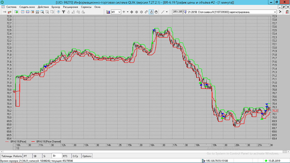 13.05.19г. Понедельник Сегодня было 6 сделок по нефти. Заходил от уровня, но 1 раз не сработал стоп. К вечеру всё наладилось и второй сделкой перекрыл убыток. На вечерней сессии использовал робота. Помогло. Было 19100р. Стало 21057р. Результат +1957р. (+10,24%) Время торговли 2 часа. Ошибки: долго и много торговал.
