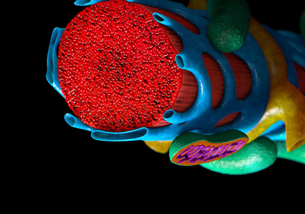 Далее саркоплазма (грубо говоря мышечная цитоплазма или даже миоплазма) вокруг мышечной «основы», а именно саркоплазматический ретикулум (сеть), главная цель которой передавать кальций от нейронов в саркомеры и митохондрии – так называемые энергетические станции, (причём именно в мышцах у нас их больше всего), также имеются рибосомы и комплекс Гольджи