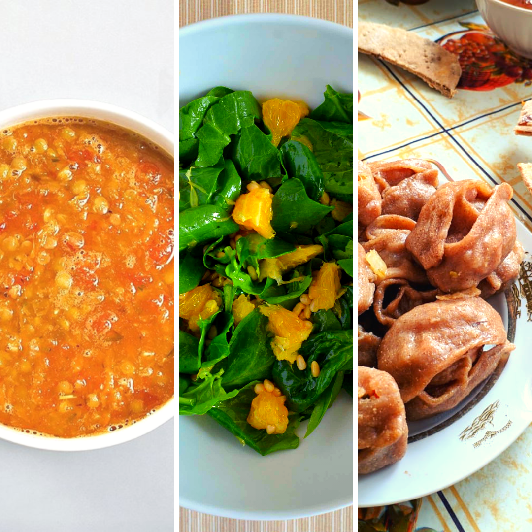 На второе - Манты из ц/з муки с овощной начинкой (тыква, капуста, перец сладкий, помидоры, морковь). -замесить тесто, подготовить овощи для начинки. почистить, обжарить в сковороде, добавить специи (зира, соль, перец) и готовить на пару до готовности (25-30 мин.) Салат - Шпинат по-катало
