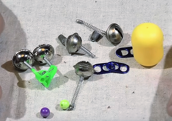 Все мы знаем уважаемые рыболовы, что сигнализатор при донной ловли штука необходимая. Сейчас я расскажу, как можно с помощью нехитрого набора изготовить удобный сигнализатор для донки. Для начала нужно взять кусок стальной проволоки длиной 20-25 см и диаметром 1 - 1,5 мм и по середине изогнуть колечко с помощью плоскогубцев. Затем взять покупные бубенчики и пропустить два конца проволоки в отверстие, которое предназначено для вставки светлячков. Есть еще один вариант, можно вставить пружины с бубенчиками со сломанных сигнализаторов. Для этого нужно несколько крайних витков пружины отогнуть на 90 градусов, затем одеть их на проволоку. Лучше всего пружину не много растянуть, для лучшей чувствительности поклевки. Далее нужно взять контейнер от киндер сюрприза и проколоть шилом две дарки. Затем продеваем оба конца проволоки в контейнер. Проволоку нужно подровнять, обкусив кусачками, а на концы одеть по бусене, можно для надежности посадить на клей. Ключи от алюминиевых банок нужны только
