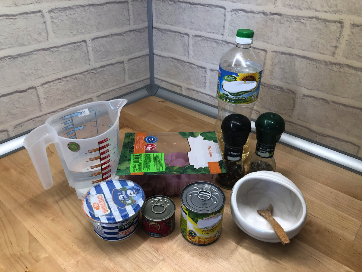 Необычно и вкусно Ингредиенты: Количество порций: 3-4; Время приготовления: 1 час 20 минут Также мне понадобились: глубокая сковорода с крышкой, разделочная доска; лопатка для жарки, ложка для помешивания, нож для мяса. 1. Порезала филе индейки на небольшие порционные кусочки. 2. Разогрела масло на сковороде и обжарила индейку на большом огне (значение 8 на индукционной панели в 10 делений) в течение 10 минут, постоянно помешивая. 3. Убавила вручную панель до значения 3. Посолила, поперчила, добавила томатную пасту и залила водой. Тщательно размешала. 4. Накрыла крышкой и оставила тушиться на 40 минут. 20 минут при делении панели 3, остальные 20 минут на делении 2. 5. По истечении времени добавила сметану, кукурузу (предварительно слив жидкость), смесь итальянских трав, снова всё перемешала, накрыла крышкой и тушила еще 20 минут на делении 2. 6. В качестве гарнира отлично подошёл рис. Получилось очень вкусно!