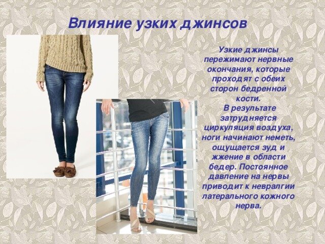 Десять причин, почему не стоит носить модные джинсы слишком часто. 1. Обтягивающие джинсы стягивают тазобедренные суставы, что впоследствии ведет к растяжению суставной капсулы.