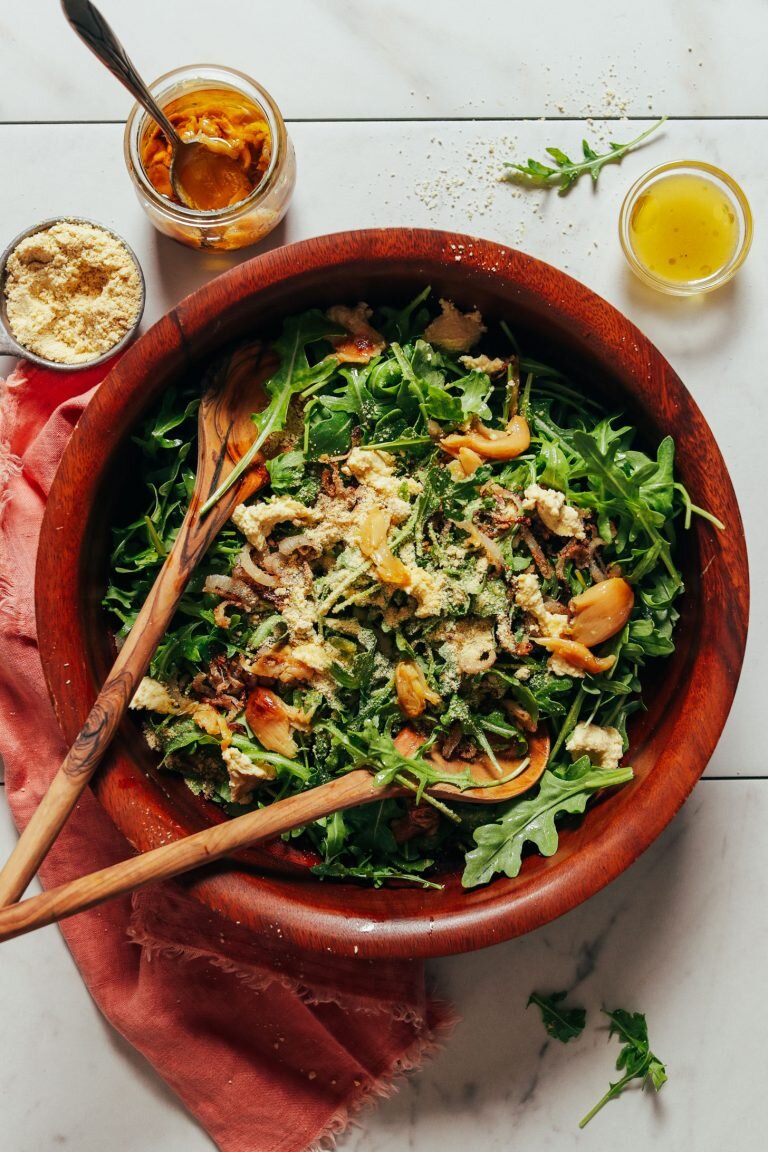 Наш салат из рукколы, жареного чеснока, лимонного винегрета, хрустящего жареного шалота и нашего 5-минутного сыра из макадамии! Идеально подходит для встречи с друзьями и не только!