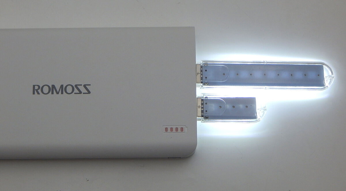Напряжение на выходе самого простого Power bank составляет 5 вольт, у продвинутых моделей с функцией быстрой зарядки может быть до 12 вольт. Желательно наличие 2 USB портов, позволит одновременно работать освещению и зарядке других устройств. Два УСБ порта можно использовать для подключения двух светодиодных ламп, направленных в разные стороны.