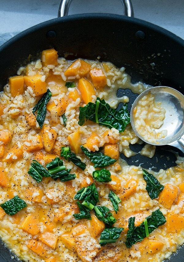 Введение, которое поможет вам во время приготовления тыквенного ризотто. - Лук добавляет сладости и жирные ароматы. - Жарка риса: здесь начинается лестница. Жареный рис усиливает аромат ризотто и добавляет нежное ореховое послевкусие с оливковым вкусом. Это делает вкус ризотто менее похожим на вареный рис и больше похож на цельное, отдельное, нюансированное блюдо. Чем дольше будет жариться рис, тем чище будет вкус ореха. Однако есть один минус - чем дольше вы будете готовить рис, тем менее сливочный ризотто вы получите. Вероятно, во время жарки мы уничтожаем крахмалы, которые отвечают за чудесную жидкую кремообразную ризотто. - Постепенное доливание бульона: мы сказали, что лестница начинается с риса? Они действительно начинаются здесь, потому что есть несколько теорий о влиянии постепенной добавки бульона. Первое говорит о том, что постепенное добавление помогает поддерживать равномерную температуру и, следовательно, рис выделяет больше крахмала. Также говорят, что благодаря этому ри