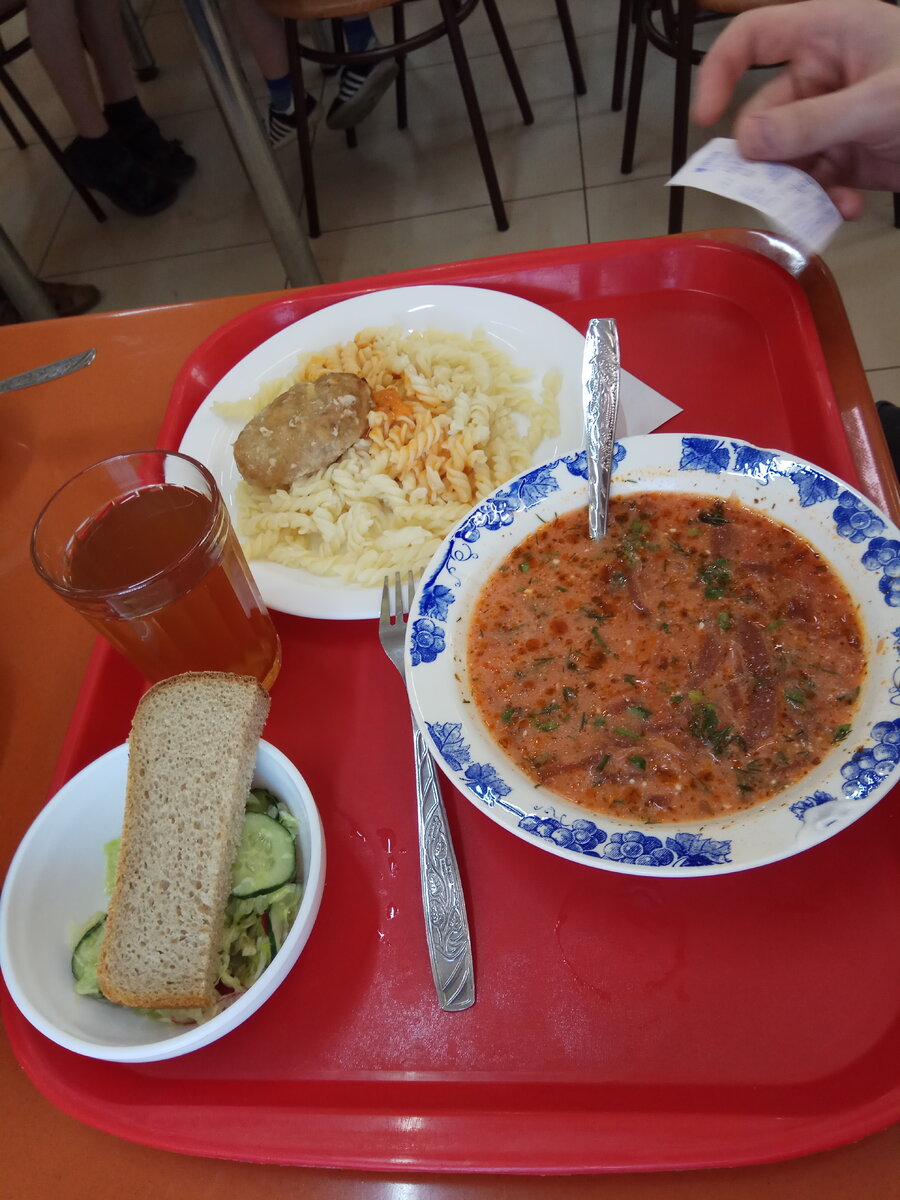 Здесь ооочень бюджетно и в принципе вкусно. Это столовая самообслуживания, берешь поднос, выбираешь салат, напитки, нужные блюда накладывает сотрудник столовой. В конце нужно убрать за собой.