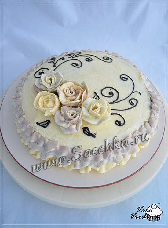 - Нанести остатки крема на верхушку торта. Можно обсыпать торт измельченными орешками, шоколадом или, как я, украсить сливочным кремом «Шарлот».