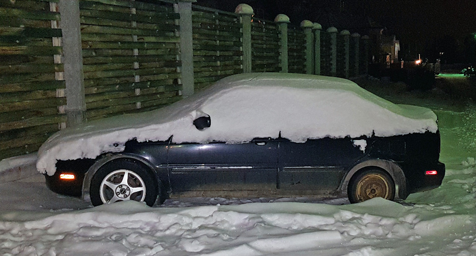 Машинка месяц провела почти хорошо. Вот такой я её вчера увидел: Очистил от снега, накачал одно колесо.
