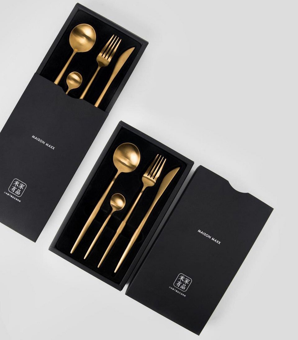 Набор столовых приборов Maison Maxx Stainless Steel Modern Flatware Set состоит из четырех предметов: ножа, вилки, столовой ложки и чайной ложки. В качестве материала для набора была выбрана нержавеющая высококачественная сталь 304, устойчивая к коррозии, царапинам, химическим и физическим воздействиям. Столовые приборы производятся вручную небольшими партиями из заготовок, которые проходят несколько этапов ковки, что придаёт им высокую прочность и позволяет создать изысканный внешний вид. Полировка и шлифование придали приборам идеальную гладкость и заставил металл «играть». За счет того, что каждый столовый прибор прошел через технологию вакуумной металлизации (эффективная технология получения специальных покрытий), имитирующей золочение, хромирование, омеднение и никелирование, набор доступен в трех цветах: золотом, серебряном и черном. Благодаря современным технологиям приборы не теряют металлический блеск, но приобретают благородный матовый оттенок. Каждый набор упакован в красив
