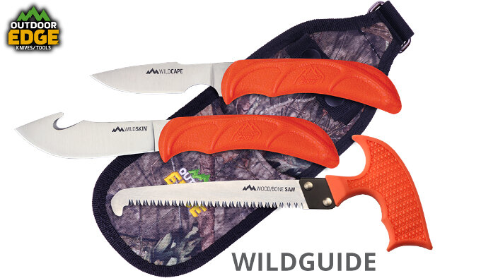 Outdoor Edge Cutlery представили новый набор охотничьих ножей WildGuide, состоящий из пилы с Т-образной ручной, а также двух ножей для работы с дичью. Нож "Skinner" для работы со шкурой и разделыванием дичи оснащен 10,2 см закругленным клинком с завышенным кончиком, выпуклым лезвием и загнутым крюком на обухе, а второй "Caper" для более деликатных работ имеет 6,4 см клинок направленной формы Drop Point (заниженный от обуха кончик) с крупными изгибами перед лезвием и на обухе под упор пальцев, обеспечивая надежный хват.