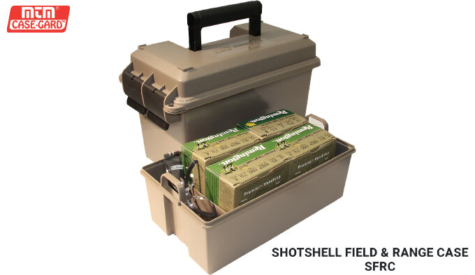 MTM Molded Products Co представили новый ящик для патронов и аксессуаров Shotshell Field & Range Case со съемным внутренним лотком. Разработанная специально для стрелков из гладкоствольного оружия литая конструкция ящика с откидывающейся крышкой на двух независимых замках-защелках имеет кольцевой уплотнитель по краям, защищающий от попадания воды и внешних загрязнителей. Дополнительно по краям сформованы сквозные отверстия для установки навесных замков или карабинов. Внутри установлен съемный лоток с двумя боковыми ручками в форме петель, разграничивающий внутренний объем между патронами, аксессуарами и снаряжением. Для комфортной транспортировки и хранения сверху расположена складывающееся широкая ручка и фиксирующие направляющие для штабелирования ящиков друг на друга. На данный момент ящик выпускается в песочном FDE цвете. - Вмещает более 100 гладкоствольных патронов в лотке и дополнительно под ним