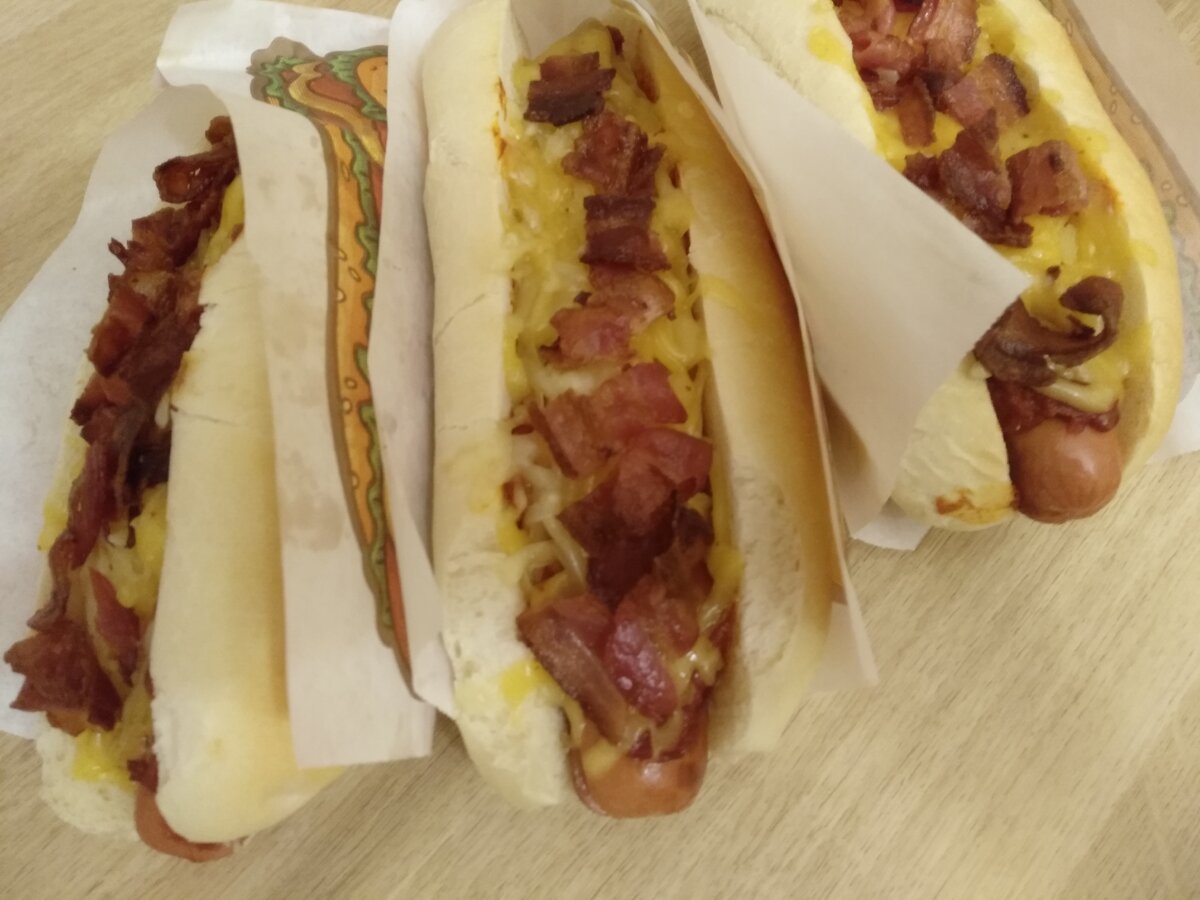 Очень легкий и вкусный хот-дог по рецепту самой известной американской компании, специализирующейся на хот-догах. На 3 хот-дога: 3 булочки для хот-догов 3 сосиски соус "Барбекю" 170 гр. чеддера 6 кусков сыро-копченного бекона Начинаем готовить. Все что нам будет нужно это приготовить соус "барбекю" и пожарить бекон и сосиски. Как готовить соус "барбекю" можно посмотреть здесь. Конечно, вы можете купить готовый, но только если вы уверены в качестве его вкуса. Здесь соус играет практически главенствующую роль и при некачественном продукте вы рискуете испортить блюдо и не получить вкус которого мы добиваемся. Бекон жарим в духовке или на сковороде. Нам нужно получить хрустящую корочку, но смотрите чтобы не подгорел. Даем немного остыть и крупно нарезаем. Сыр трем на терке. Теперь самое время пожарить сосиски на гриле. Собираем. Булочки разрезаем, укладываем в разрез сосиску, сверху хорошую порцию соуса, чеддер и затем бекон. Перекладываем на противень и на несколько минут ставим в дух