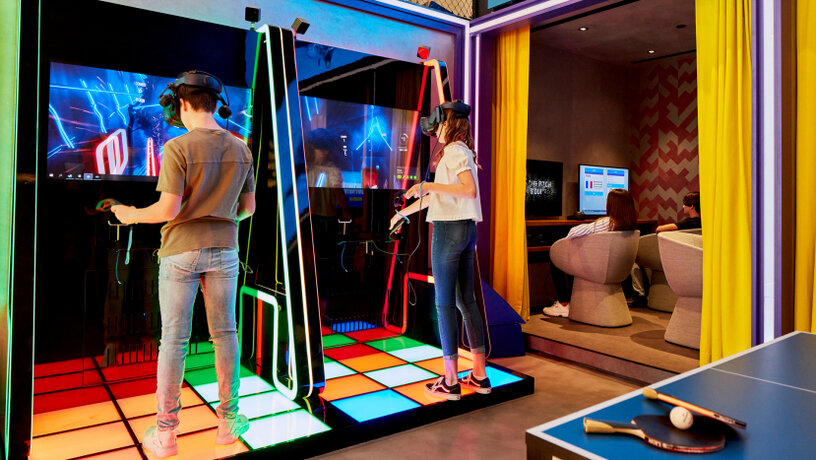 Широко представлены на территории центра симуляторы виртуальной реальности, каждый – в своей секции. Пространство выдержано в ярком, футуристичном дизайне. Здесь можно найти столы для бильярда и тенниса, стену для скалолазания, а также станции для подзарядки телефонов.
