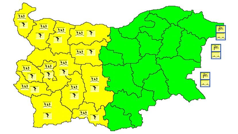 На сегодня, 15 мая, из-за интенсивных дождей с грозой в 13 областях Болгарии объявлен «желтый» уровень опасности, показывают данные Национального института по метеорологии и гидрологии. Метеорологическая опасность в силе в областях: Видин, Монтана, Враца, Плевен, Ловеч, София, София – область, Перник, Кюстендил, Благоевград, Пазарджик, Смолян и Пловдив. В этих областях сегодня ожидаются интенсивные дожди с грозой. На многих местах среднее количество осадков достигнет 25-30 л/кв.м. Из-за интенсивных дождей в 13 областях Болгарии объявлен «желтый» уровень опасности