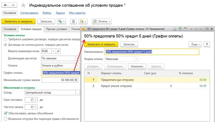 Согласно графику, установленному в соглашении, автоматически рассчитываются этапы оплаты в самом документе (Заказ клиента или Реализацию товаров и услуг). При необходимости их можно скорректировать вручную по ссылке в поле Оплата и перенести в документ, не меняя при этом данные в справочнике.