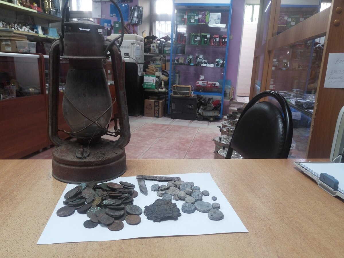 В другом месте рядом выкопал фрагмент швеллера, и фрагмент ТНВД от трактора (это топливный насос высокого давления), нашлась солдатская пряжка, ржавый перочинный нож, несколько монет, какие то свинцовые пломбы. Все это загрузил в УАЗ, плуг оказался большой, еле залез в машину. Шурик поехал в пункт сдачи металла. На приеме, когда взвесили весь чермет, на руки выдали 1670 рублей. День прошел у копателя не в пустую, а остальное, что посчитал нужным он привез мне, для антиквариата: это пломбы из свинца, царские монеты, мелочь ссср, лампа. Серьезного ничего не было.