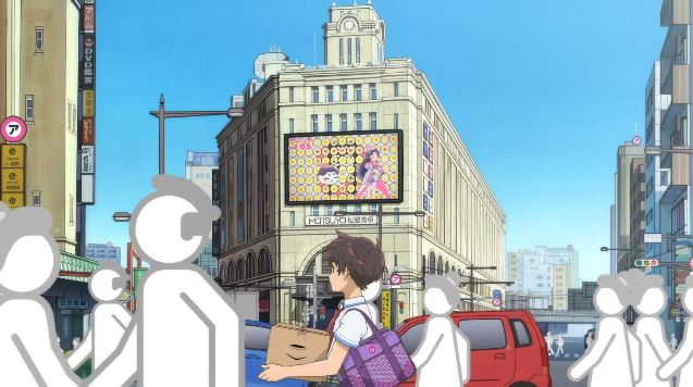 Одна из самых ярких визуальных метафор, которые есть в аниме Mawaru Penguindrum и Sarazanmai — это визуализация прохожих как абстрактных людей с дорожных знаков. Скорее всего этот способ визуализации уже где-то был использован, но в Sarazanmai он работает как надо. Одна из центральных тем аниме — связь между людьми. В городе (который априори противопоставлен деревне с её общиной) люди разрозненны, атомизированы, объединены в первую очередь экономическими связями (купля-продажа) и воспринимают других чаще всего как инструмент для удовлетворения собственных потребностей. Каждый житель города видит за день сотни и тысячи людей, но для него они — не более чем статисты. Они не обладают индивидуальностями, максимум — внешностью и одеждой, которая в конечном итоге тоже типологизируется и привязывается к стереотипам восприятия. А это вновь лишь отрицание уникальности и ценности другого человека.