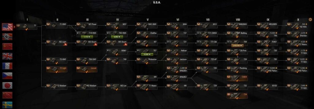 Имеется тяжелобронированный не турельный танковый эсминец линии с отличной огневой мощью, но низкой мобильностью. Линия эсминца с башенкой, приносящая немного всего на стол. Легкие танки, которые являются универсалами, но с огневой мощью выше среднего. Медиумы, которые являются отличным корпусом истребителей. Тяжелые танки с надежными орудиями, которые оседлают линию "тяжелых сред". Смешанная линия автоматическ-затяжелителя с превосходным взрывом и DPM. И последнее, но не менее важное, SPGs, которые отскакивают между высоким уроном за выстрел и гибкостью.