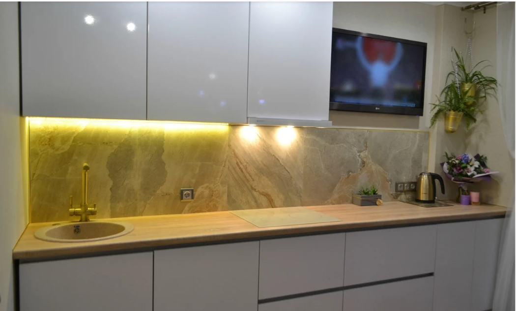 Я давно слежу за проектами Ольги Уляевой. Она делает ремонт уже далеко не первый раз. В одном из своих сообщений Ольга написала примерно следующее: "Квартиру с первым ремонтом продай врагу, со вторым приятелям, с третьим — друзьям, с четвертым — родственникам". Т.е. с каждым разом хозяйка, которая делает дизайн в квартирах сама, учится подмечать хорошие и плохие решения. И делает с каждым разом все лучше. Ссылку на другой пример кухни Ольги дадим в конце публикации. Кухонный гарнитур классический белый с интегрированными ручками. Несмотря на то, что белый цвет считается марким, на самом деле за ним легко ухаживать. Пыль не видно. Любе капли отмываются просто —достаточно протереть влажной тряпкой со средством для стекол. Кухонный фартук выполнен из натурального камня. Рисунок плит очень красивый. Обратите внимание, на кухне проходит вентиляционная шахта. Из-за нее кухня стала сложной формы. Ольга придумала, как обыграть этот момент и использовала пустующий угол. Поставила туда шкаф-пена
