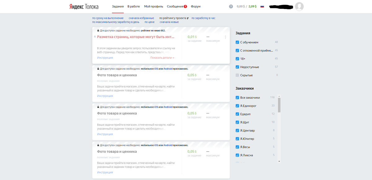 Добрый день, сегодня мы рассмотрим простой заработок в интернете без вложений. У Яндекса существует сервис под названием Яндекс.Толока. Сервис предлагает задания, при выполнении которых на ваш счет зачисляется вознаграждение. Задания делятся на две группы: 1. Задания которые выполняются дома с компьютера или с мобильного устройства: оценка фотографий, оценка состояния машин каршеринга, поиск запрещенного контента, оценка поисковой выдачи и т.д. 2. Так называемые "полевые" задания, суть которых заключается в том что бы сфотографировать ту или иную организацию и отправить эти фотографии на модерацию. Зарегистрироваться в сервисе может любое лицо достигшее 18 лет. Однако будьте внимательны, регистрация с одного номера телефона доступна только один раз, при случайном или специальном удалении повторно аккаунт создать невозможно! Все задания можно отфильтровать на ваш выбор, учтите что вознаграждение зависит напрямую от вашего рейтинга, так что к процессу обучения нужно подходить ответствен