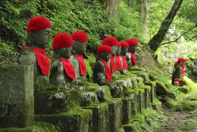 Тем, кому приходилось бывать в Японии, а также тем, кто часто смотрит японские фильмы или аниме, наверняка приходилось видеть небольшие каменные статуи в ярко-красных фартучках из ткани (а иногда еще и в детских шапочках) — таких в Японии великое множество. Чаще всего они встречаются на территориях храмов, на кладбищах и у дорог, зачастую сразу группками. Что же это за известнейшая личность?