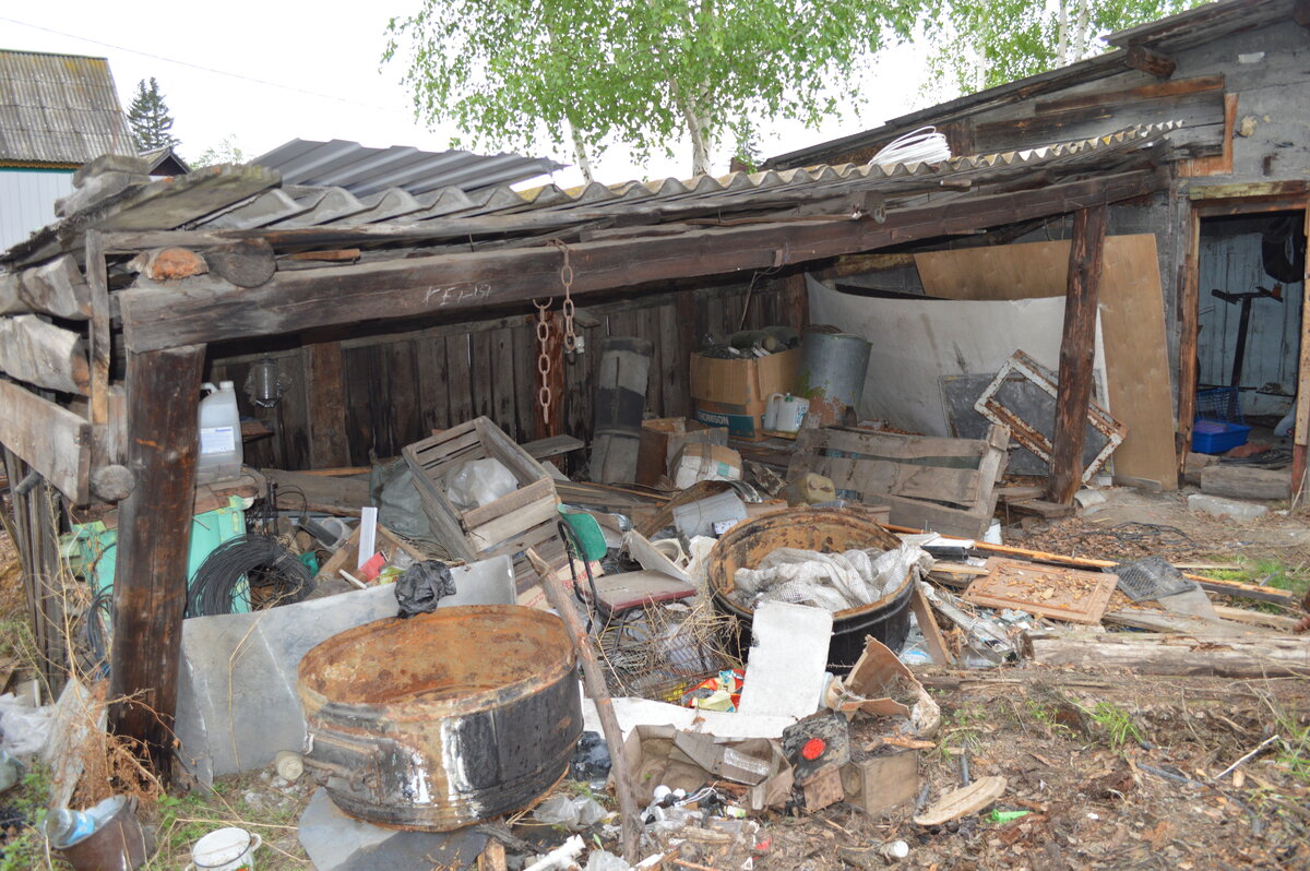 Первый день по реконструкции и обустройству гаража начинается с наведения порядка на территории, которая к нему примыкает. Первая сторона, где будет наводиться порядок это стена с дверью. Нужно выкинуть весь хлам. Разобрать постройку которая вот, вот упадет. Начинаем уборку с бревен которые пойдут только на дрова мы их переносим и складируем с другой стороны гаража, после будет выбран день и мы их распилим и складируем в банный дровеник. Весь хлам, который копился неизвестно сколько лет, будет свален в яму которая имеется в гараже, так как машину я в гараж загонять не буду, и яма мне не нужна я ее завалю строительным мусором и засыплю либо песком либо отсевом, посмотрим что будет дешевле. Шифер с крыши постройки так же будет использован для засыпки ямы. Он в ужасном состоянии и использовать его еще куда то не представляется возможным. Сама постройка деревянная, но доски сгнили и как вторичный строительный материал уже нельзя их применить, поэтому пойдут они в топку печи. Какой-то алг