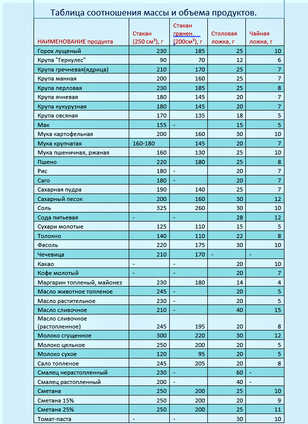Очень часто нет возможности, а иногда и желания, при приготовлении пищи пользоваться кухонными весами. И тогда, мне на помощь приходит данная таблица - Соотношения массы и объема продуктов. Делюсь ею с Вами, возможно кому то пригодится))). ☝Если данная информация была Вам полезна - поставьте Класс👍, напишите комментарий и поделитесь в соцсетях. Подписывайтесь на мой канал, новые рецепты 3-4 раза в неделю! Всем всего самого вкусного и до скорой встречи!😘 И предлагаю Вашему вниманию новый видео-ролик, который недавно вышел на моем ютуб-канале, с рецептом очень вкусного и нежного пирога: