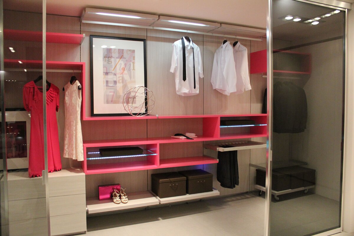 Какой может быть подсветка в гардеробной? Это необходимость или стремление к прекрасному? Что лучше: купить готовый вариант или сделать систему хранения под заказ? Давайте разбираться. ТИПЫ ПОДСВЕТОК ДЛЯ ИНТЕРЬЕРНЫХ СИСТЕМ ТОЧЕЧНАЯ ПОДСВЕТКА В ГАРДЕРОБНОЙ Для оформления используются точечные светильники: их устанавливают в стенки шкафов, верхние модули кухонных гарнитуров и прочие места, подсказанные Вашей фантазией. Этот тип подсветки характеризуется минимальной дозой изюма и встречается в интерьерах 10-летней давности. Из плюсов: пожаробезопасность, простота в обслуживании, долгий срок службы. Недостатки: сложность в проектировании и организации. В гардеробной на заказ точечную подсветку можно сделать на узких шкафах и на некоторых элементах интерьера. КОНТУРНАЯ ПОДСВЕТКА ДЛЯ ШКАФА Контурная подсветка (умеренная доза изюма) оформляется по контуру дверей, ниш, полок и т.д. – отсюда и название. Особенно эффектно смотрится в стеклянных и зеркальных интерьерах. Используя контурную подс