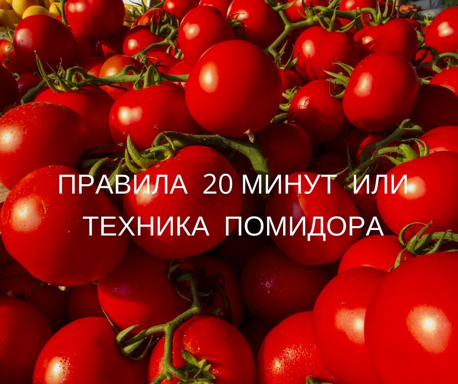 Правила 20 минут или техника помидора. Эту технику управления временем и повышением концентрации придумал будучи студентом Франческо Чирилло (Francesco Chirillo). Основная идея пришла мне в конце 80-х, Я тогда учился на начальных курсах университета. Когда утихли восторги от сдачи первой сессии, Я ощутил спад и большое замешательство." - пишет Франческо в предисловии своей книги. "Каждый день Я приходил в университет, слушал лекции, и возвращался с ужасным ощущением того что у меня ничего не получается, что Я только зря трачу свое время. Экзамены приближались с огромной скоростью, и откладывать больше было нельзя." "Когда Я посмотрел на своих сокурсников, и на себя, стало понятно, что в основе моих бед лежит низкая концентрация и множество отвлекающих вещей. И тогда Я поспорил сам с собой: