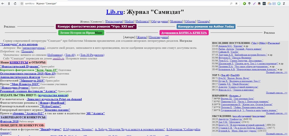 Давно уже зрела у меня идея сделать обзор крупнейших русскоязычных сайтов, на которых сетевые писатели выкладывают своё творчество. Я уже встречала несколько подобных публикаций, но предназначались они, в основном, авторам. А что же на таких площадках может отыскать для себя читатель? Во-первых, прочесть горячие новинки. Во-вторых, подписаться на любимых авторов и всегда быть в курсе последних обновлений. В-третьих, открыть для себя новые имена и книги. В-четвертых, легально, не нарушая авторских прав, читать произведения из открытого доступа, а таких там, по моему читательскому опыту, очень много. Более того, на некоторых порталах продажи вообще не предусмотрены, как, например, на "герое" сегодняшнего обзора, старейшем писательском ресурсе рунета - портале Самиздат. В-пятых, читатель может быть на связи непосредственно с автором, и при желании сказать всё, что думает о его нетленках. Желательно, чтобы все-таки "спасибо". Впрочем, как показывает практика, рядовой читатель к подобно