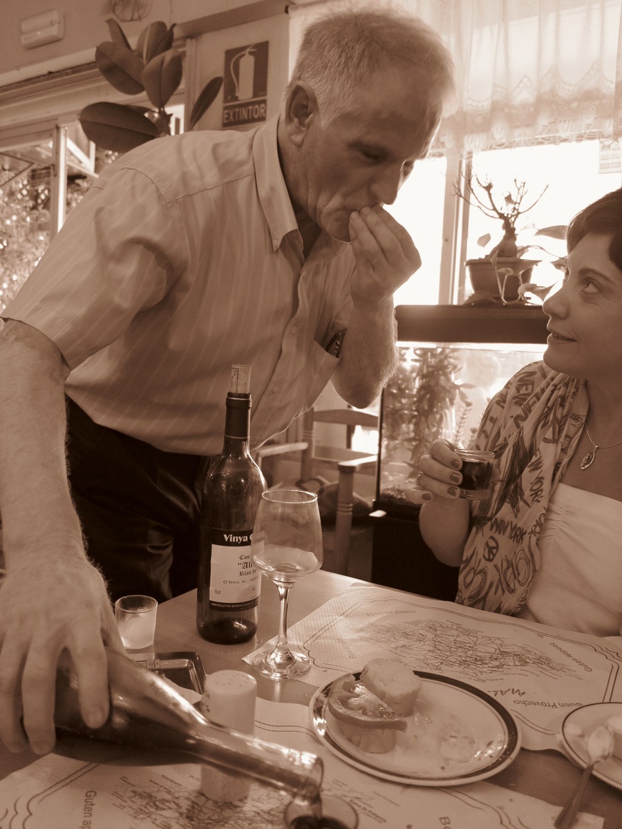 Продолжить свою рубрику о людях, которые мимолетно встречаются на нашем пути, но запоминаются на всю жизнь, я хочу рассказом о замечательном владельце домашнего ресторанчика в курортном Эль-Аренале на Майорке. Это заведение под названием Rias de Vigo casa Alfonso находится в глубине улиц Ареналя (Calle Terral 40 | Zona hotel Bahia de Palma, 07600 Эль-Ареналь, Майорка, Испания). Так что попали мы туда совершенно случайно. И не ошиблись. Жаль только, что это случилось уже в конце нашей поездки, иначе бы ходили, я так думаю, только туда. Было время обеда, и в этом ресторанчике было полно народа. Впрочем, как выяснилось позже, народ здесь есть всегда. Нас привлекло, что можно заказать обед по цене 9,5 евро. На улице столики были заняты, да и не скажу, что там было комфортно, так как дело было в августе, и солнце припекало. Внутри кафе места были, и мы сели за столик. Кстати, мебель тут была основательная, стулья очень добротные, хоть и повидавшие виды. По залу очень быстро носился с блюда