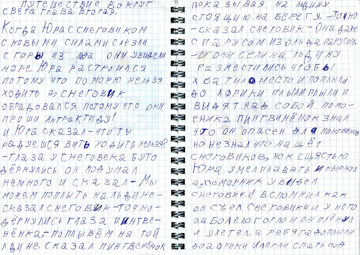 <- Глава первая <- Глава вторая: Когда Юра со снеговиком с новыми силами слезли с горы изо льда — они увидели море. Юра расстроился потому, что по морю нельзя ходить, а снеговик обрадовался потому, что они прошли Антарктиду. И Юра сказал — что ты радуешься, ведь ходить нельзя? Глаза у снеговика будто дёрнулись, он подумал немного и сказал — Мы можем поплыть на льдине — сказал снеговик. — Точно! — дёрнулись глаза пингвинёнка, — поплывём на той льдине — сказал пингвинёнок, показывая на льдину, стоящую на берегу. — Точно! — сказал снеговик — Она даже с парусом. И они сели на льдину, разместились, чтобы хватило места и поплыли. И видят над собой поморника. Пингвинёнок знал, что он опасен для пингвинов, но не знал — что на счёт снеговиков. Но, к счастью, Юра умел плавать и нырнул, а поморник увидел снеговика и вспомнил как он съел снеговика и у него заболело горло. И он плюнул и улетел, а ребята доплыли до Африки и легли спать под пальмой! Глава третья ->