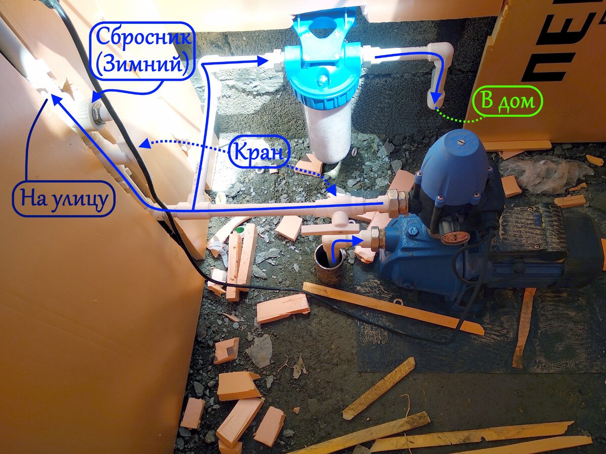 Решил с сегодняшнего дня, делать небольшие отчёты о проделанной работе. Не собираюсь ни кого учить, просто буду рассказывать как и что делаю, делиться своим опытом и отвечать на ваши вопросы, может кому пригодится! Сегодня делали обвязку скважины, которую забыли ранее, под неё был изготовлен колодец, залита плита и установлен люк. Нашей задачей была установить насос с электронным реле давления, который стоял в доме и сильно шумел, то есть перенести его в яму! Глубина скважины 5 метров, насос Aquario 1000 Ватт, на фото ниже можете посмотреть фото разводки. Извините за бардак и качество съёмки, утеплял и солнце сильно светило. В скважину опустили полипропиленовую трубу Ø25, на конце обратный клапан с сеточкой, далее вход в насос, поставили американку, без переходных, нашли с дюймовой резьбой. Выход из насоса: Американка, резьба 1 дюйм с переходом на полипропилен Ø20, затем аварийный кран, тройник, после тройника на права пошла разводка в дом, по пути поставили фильтр. Ну а вторая труба