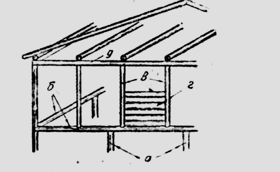 Каркасное домостроение началось уже довольно давно.Конечно в основном такой тип домов предлагался для южных регионов, но после Великой Отечественной войны, архитекторы предложили наиболее быстрый и недорогой метод возведения жилья. Строительство каркасных домов предлагалось начать с возведения каркаса из бревен. Основание строилось на деревянных стульях или каменных столбах с забутовкой (о). В качестве забутовки предлагалось использовать двойные деревянные щиты, промеж которых насыпалась прокаленная земля, сухой торф и все это перемешивалось с известковой пушенкой. Нижняя обвязка (б), строилась из толстых бревен, диаметром более 300 мм. Лучше всего и более надежней предлагалось применить два ряда бревен, так это основание вполне ремонтопригодно и способно выдержать большую нагрузку. Стойки (в) ставились в шип и для них применялись бревна 220 мм диаметром, на расстоянии 1-1,5 метра друг от друга. На боковых поверхностях стоек выбирается пазы, в которые входят гребни коротких бревен (